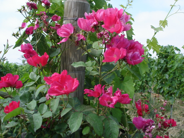 Laura takes care of the beautiful roses that head each vine row. Roses are often planted in vineyards for aesthetic reasons but more importantly they serve as a monitor for the health of the vine. Parasites attack the roses before they would attack a grape vine and thus give ample warning if any measures need be taken. Laura’s roses were shining beautifully on a recent visit.