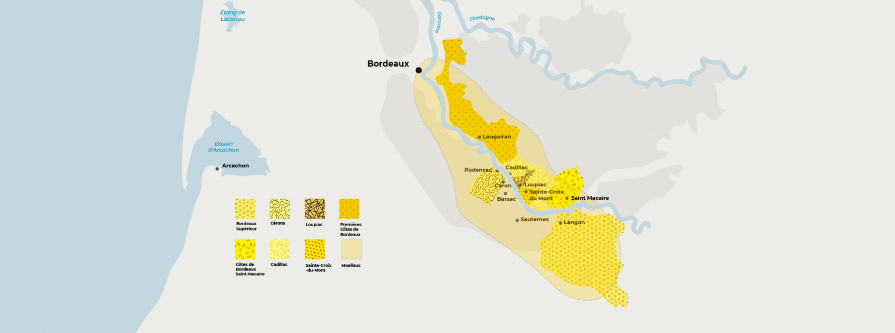 There are eight AOCs: Bordeaux Supérieur, Côtes de Bordeaux Saint-Macaire, Sainte-Croix-du-Mont, Loupiac, Cadillac, Premières Côtes de Bordeaux, Cérons and Bordeaux Moelleux.