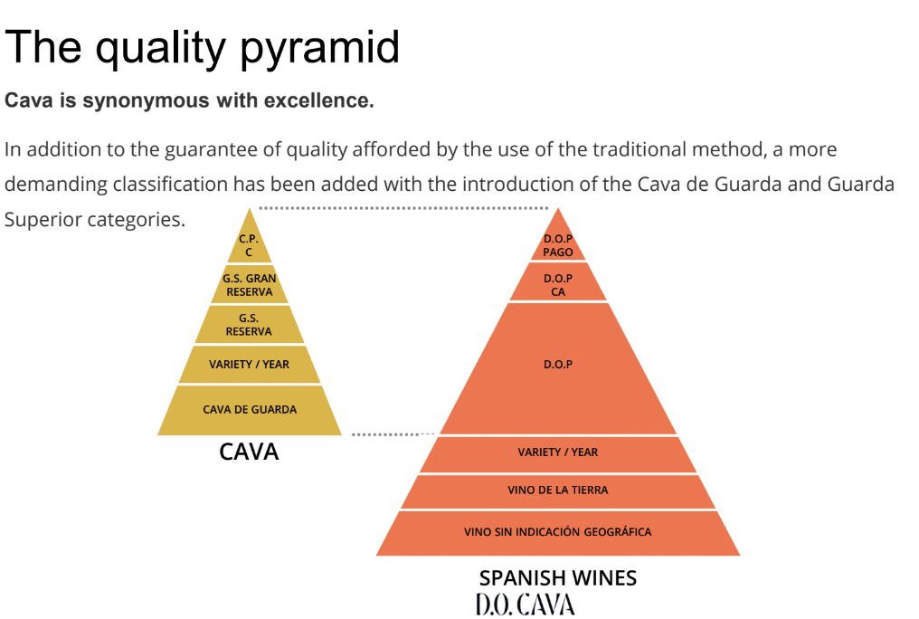 There are four Cava categories: Cava De Guarda which is released after 9 months, Cava De Guarda Riserva, released after 18 months and Cava De Guarda Superior Gran Riserva which is released after 30 months. The new category, Cava De Guarda Superior de Paraje Calificado has specific rules including minimum yields, hand harvesting, vines over 10 years of age, vinification on the estate, minimum aging 36 months, and precise traceability, among others.