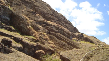 It’s actually hard to fathom how large these statutes are unless you are looking directly at them. These photo shows people walking around the site where the stones to make the Moai came from. This quarry still has some Moai statues built into the rock which were never finished and put on altars.